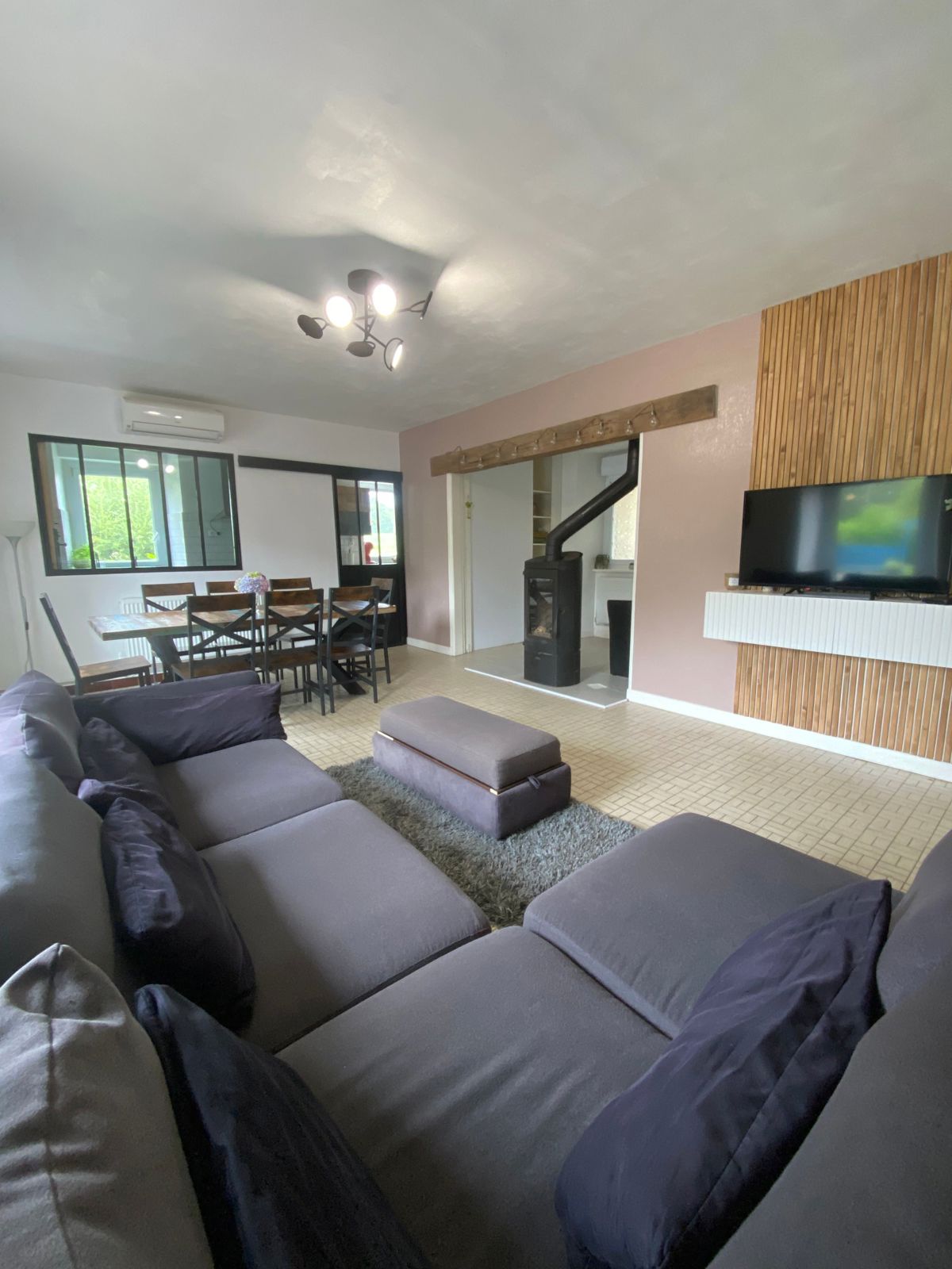 Entering in through the main front door leads straight into a large, open plan living/ dining room which is spacious, light and airy with aircon, comfortable L shaped sofa, plus poof and a large dining area, smart tv with netflix and wifi.